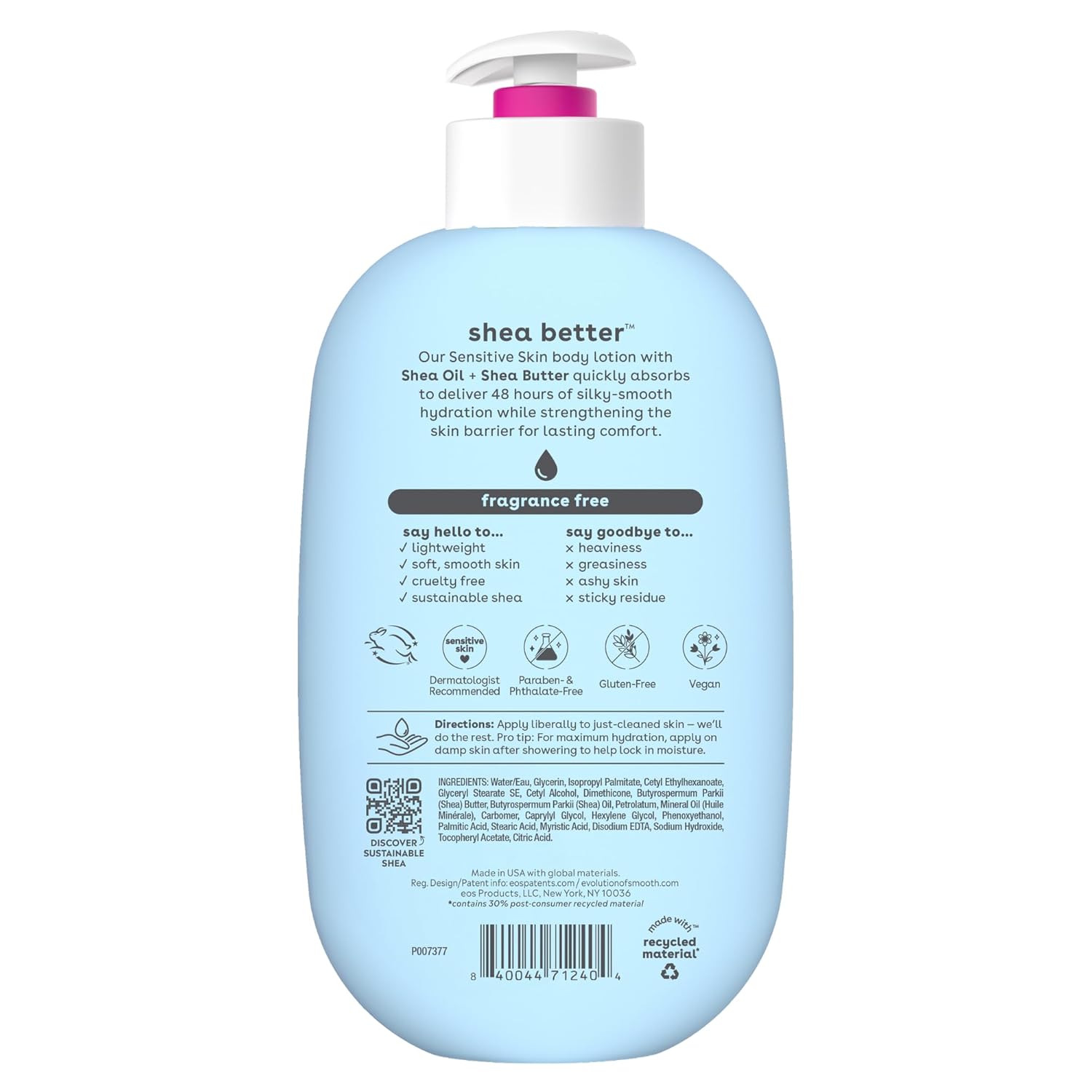 Give your sensitive skin the deep hydration it needs with eos Shea Better Sensitive Skin Body Lotion. Dermatologist-recommended and National Eczema Association (NEA) approved, this fragrance-free, hypoallergenic formula delivers up to 48 hours of moisture. With 100% natural shea butter, instantly moisturizing shea oil, and 7 nourishing oils + butters, this lightweight, non-greasy lotion melts into skin to soothe dryness, support the skin barrier, and keep your body smooth, soft, and hydrated all day.