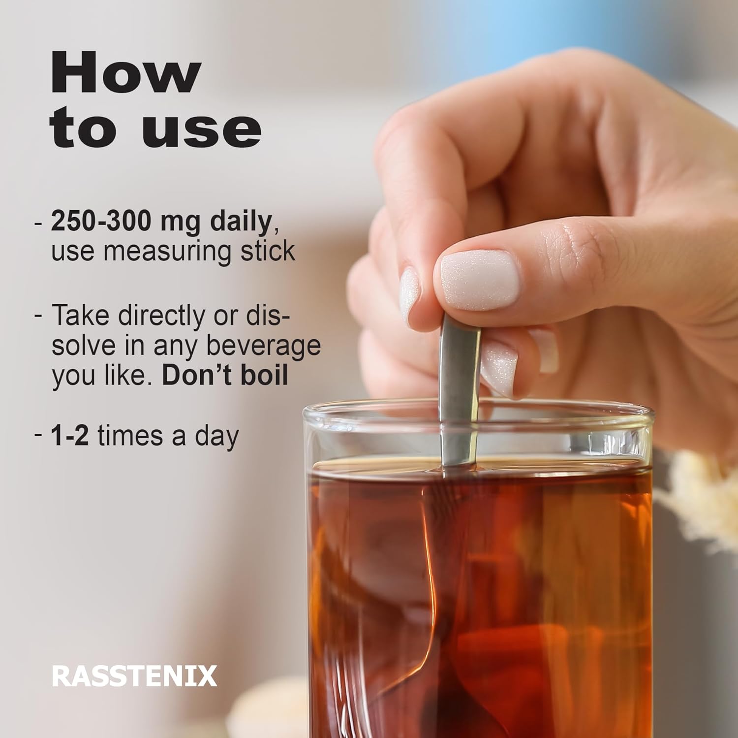 Use the included measuring stick and dissolve a pea-sized amount of resin in lukewarm water, milk, tea, or your favorite beverage. Alternatively, place directly under the tongue. Recommended daily dose: 500 mg.
