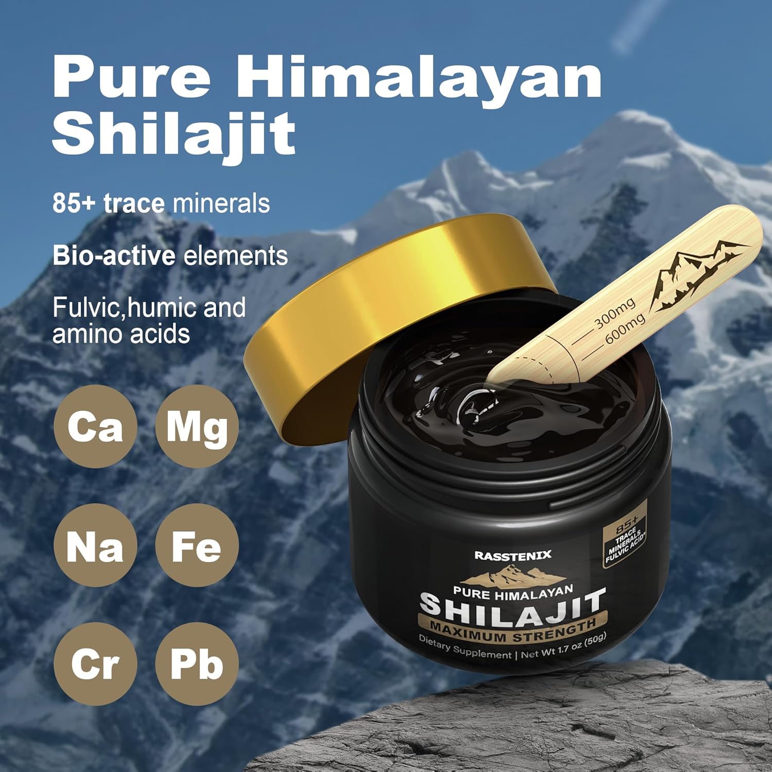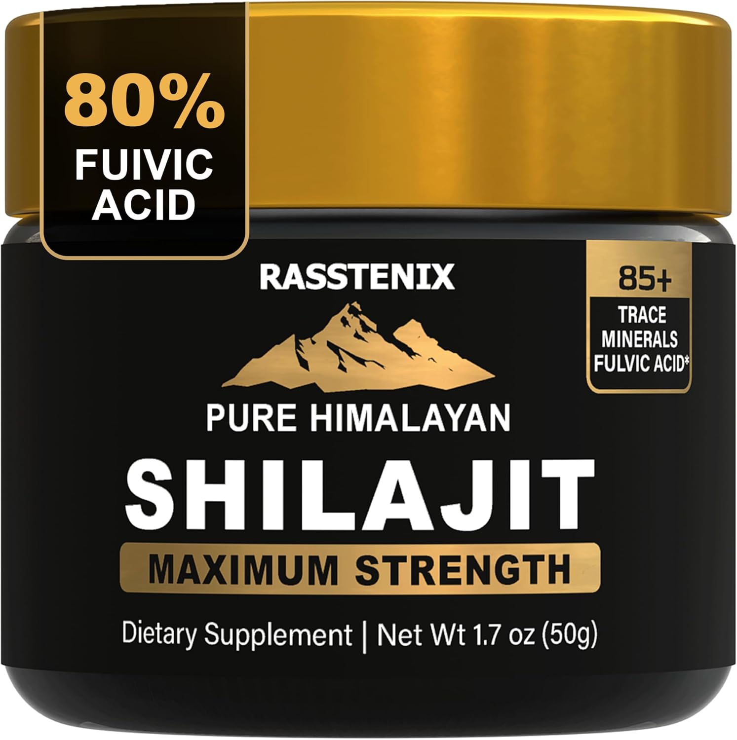 Harness the power of the Himalayas with Rasstenix Pure Himalayan Shilajit Resin – Maximum Strength (1.7 oz). Wild-harvested from 18,000 ft and purified using Ayurvedic methods, this gold-grade resin is rich in Fulvic Acid and 85+ trace minerals. It naturally enhances stamina, strength, and cognitive focus while supporting detox, immunity, and joint health. Free from additives, sugar, and GMOs, Rasstenix Shilajit is vegan, gluten-free, and GMP certified for purity and safety. Perfect for daily balance and energy — simply dissolve 250–300 mg in warm water or milk once or twice a day.
