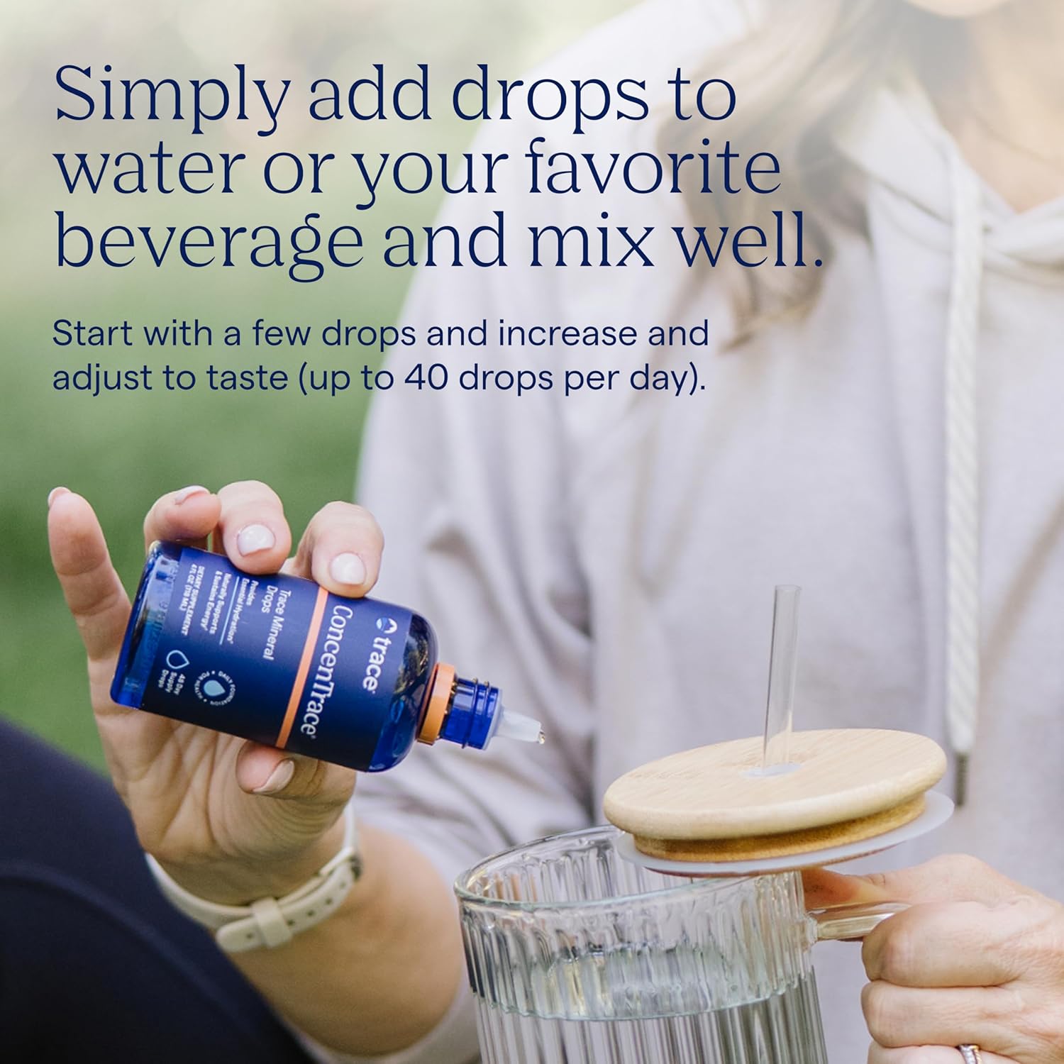 Trace Minerals ConcenTrace Drops is a concentrated liquid supplement that provides over 70 ionic trace minerals. It is commonly added to water or other beverages as part of a daily mineral intake routine. The formula is unflavored and highly concentrated, so only a small amount is typically used.